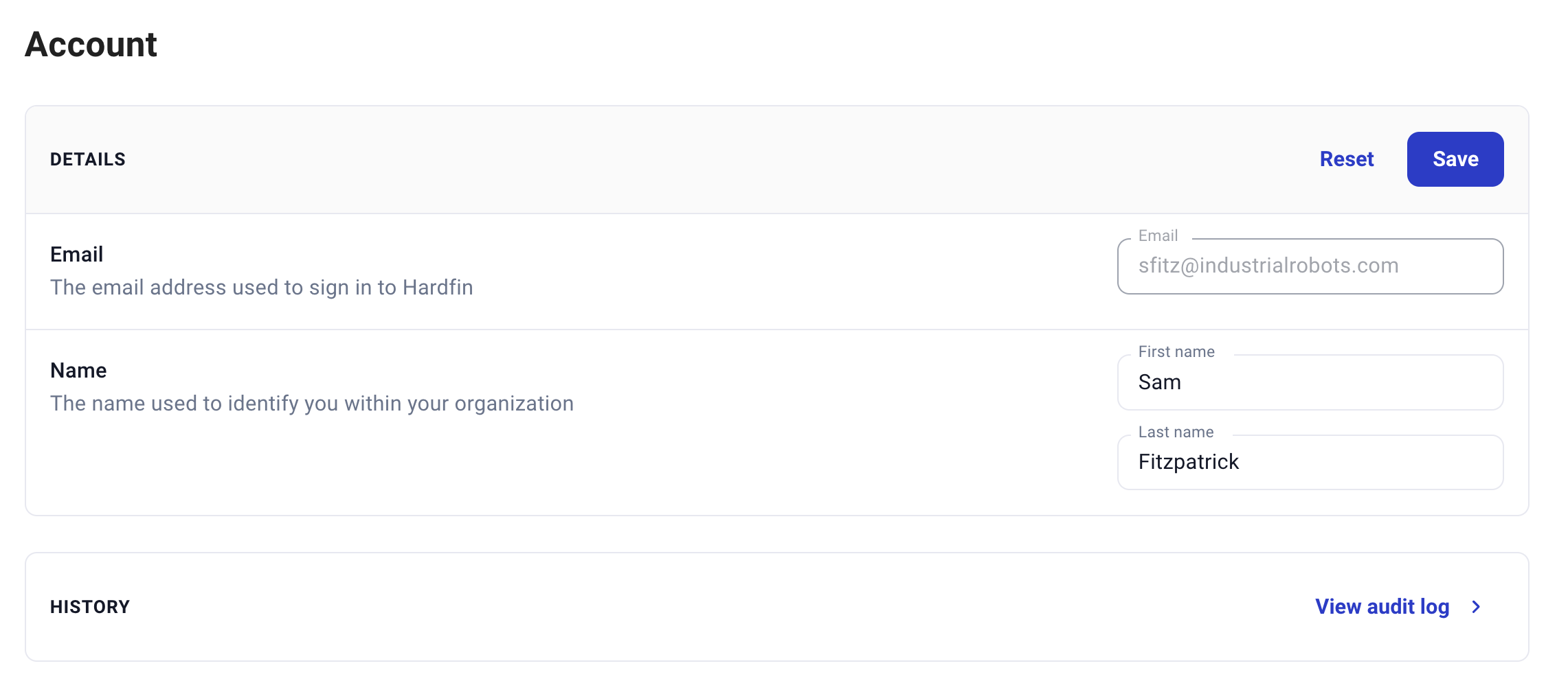 Your email address is pulled from your single-sign-on (SSO) provider, such as Google or Microsoft. You can modify your first and last name as they appear in the Hardfin platform.
