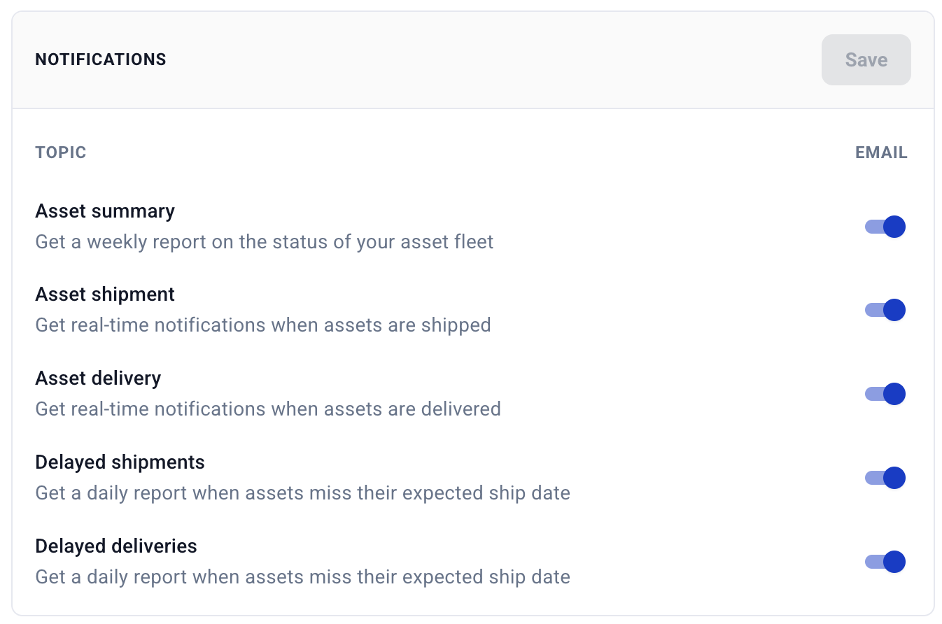 <table><thead><tr><th width="187">Type</th><th width="438">Description</th><th>Frequency</th></tr></thead><tbody><tr><td><strong>Asset summary</strong></td><td>Get notified about the status of your asset fleet</td><td>Weekly</td></tr><tr><td><strong>Asset shipment</strong></td><td>Get notified when assets are shipped</td><td>Real-time</td></tr><tr><td><strong>Asset delivery</strong></td><td>Get notified when assets are delivered</td><td>Real-time</td></tr><tr><td><strong>Delayed shipment</strong></td><td>Get notified when assets miss expected shipment</td><td>Daily</td></tr><tr><td><strong>Delayed delivery</strong></td><td>Get notified when assets miss expected delivery</td><td>Daily</td></tr></tbody></table>
